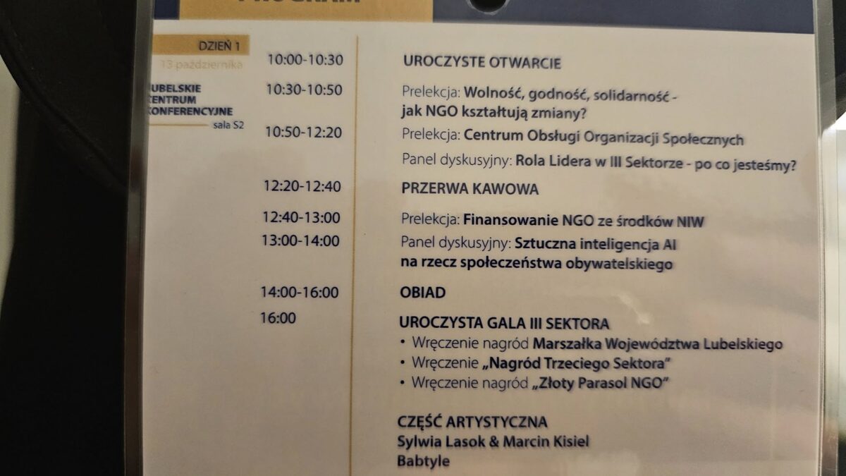Zaskoczyła nas informacja Marszałka Województwa Lubelskiego, że w regionie działa ok. 9 tys. organizacji, z czego 6 tys. aktywnie. Uczestnikom Forum miło było wysłuchać wielu słów podziękowań skierowanych do liderów NGO – ludzi, którzy „widzą potrzeby tam, gdzie instytucje często ich nie dostrzegają”. Ogromne wrażenie zrobiło wystąpienie Roberta Kawałko, prezesa Polskiego Stowarzyszenia Fundraisingu – łączyło humor, praktyczne lekcje i przypomnienie o podstawowej roli lidera: wyznaczać zadania. Po raz kolejny pojawiła się refleksja, że polski sektor społeczny to przestrzeń ogromnej kreatywności i wrażliwości. Uroczysta Gala III Sektora była powodem do dumy – nagrodzeni działacze pokazali skalę zaangażowania w regionie. Serca skradł energetyczny występ zespołu Babtyle.
