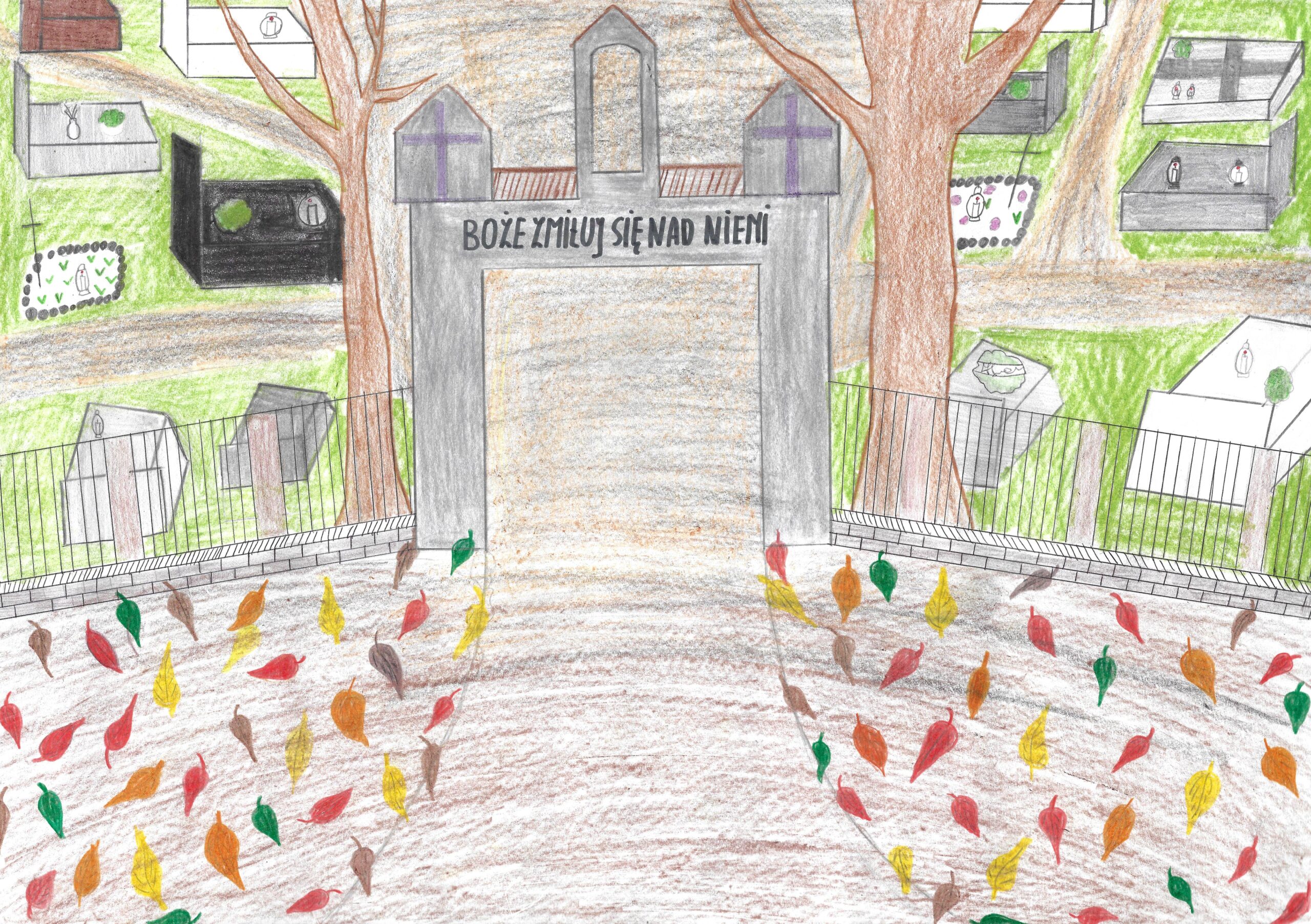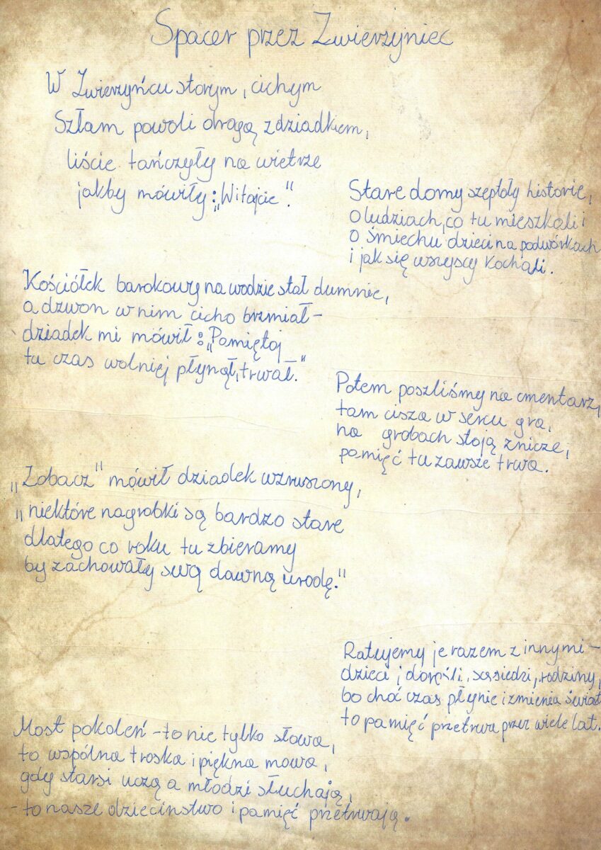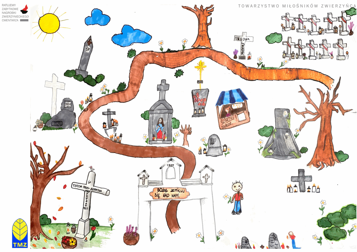 Pracę poetycką, jedyną, ale zdecydowanie zasługującą na docenienie – złożyła Milena Godzisz (4a), która była też współautorką innej pracy rysunkowej. Milena swoim wierszem zaprosiła rówieśników i ich rodziny na spacer po Zwierzyńcu i naszym cmentarzu.