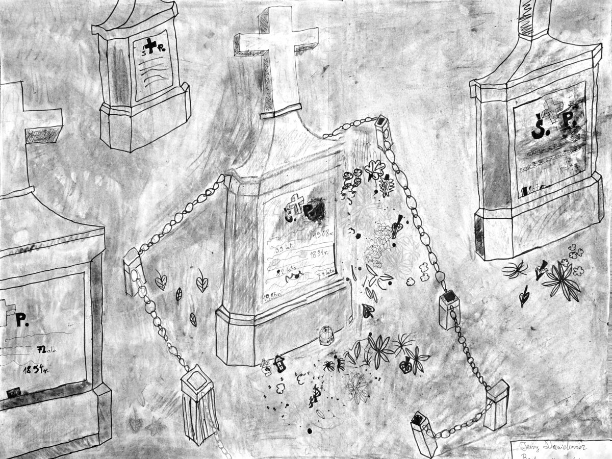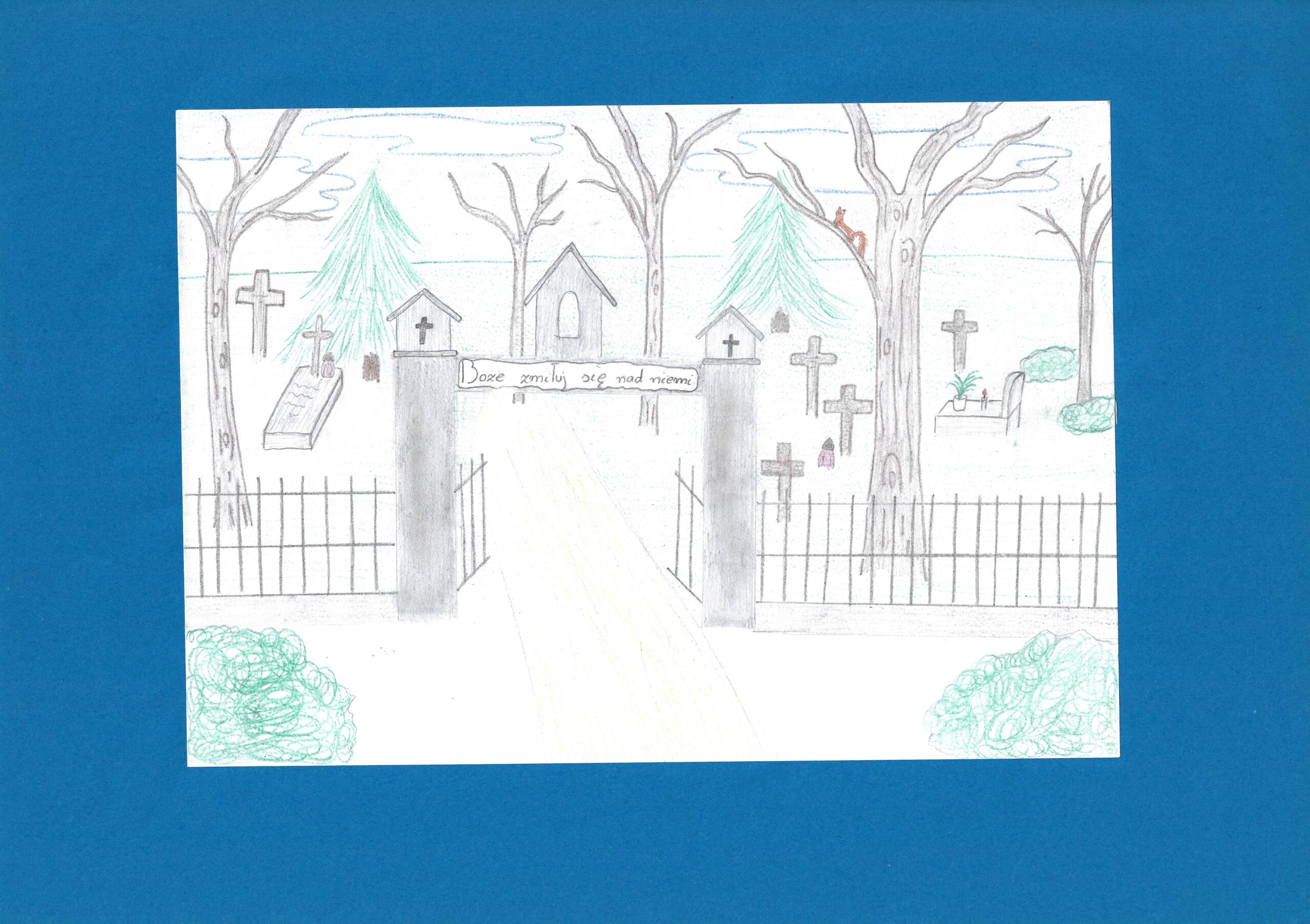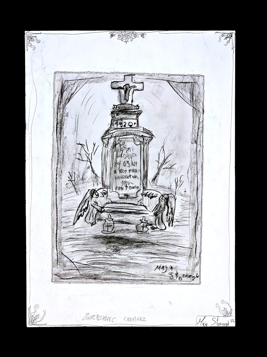 Pracę poetycką, jedyną, ale zdecydowanie zasługującą na docenienie – złożyła Milena Godzisz (4a), która była też współautorką innej pracy rysunkowej. Milena swoim wierszem zaprosiła rówieśników i ich rodziny na spacer po Zwierzyńcu i naszym cmentarzu.
