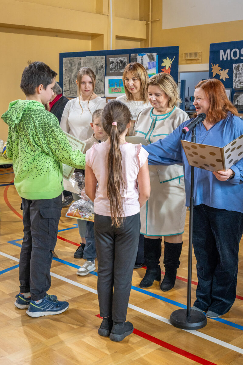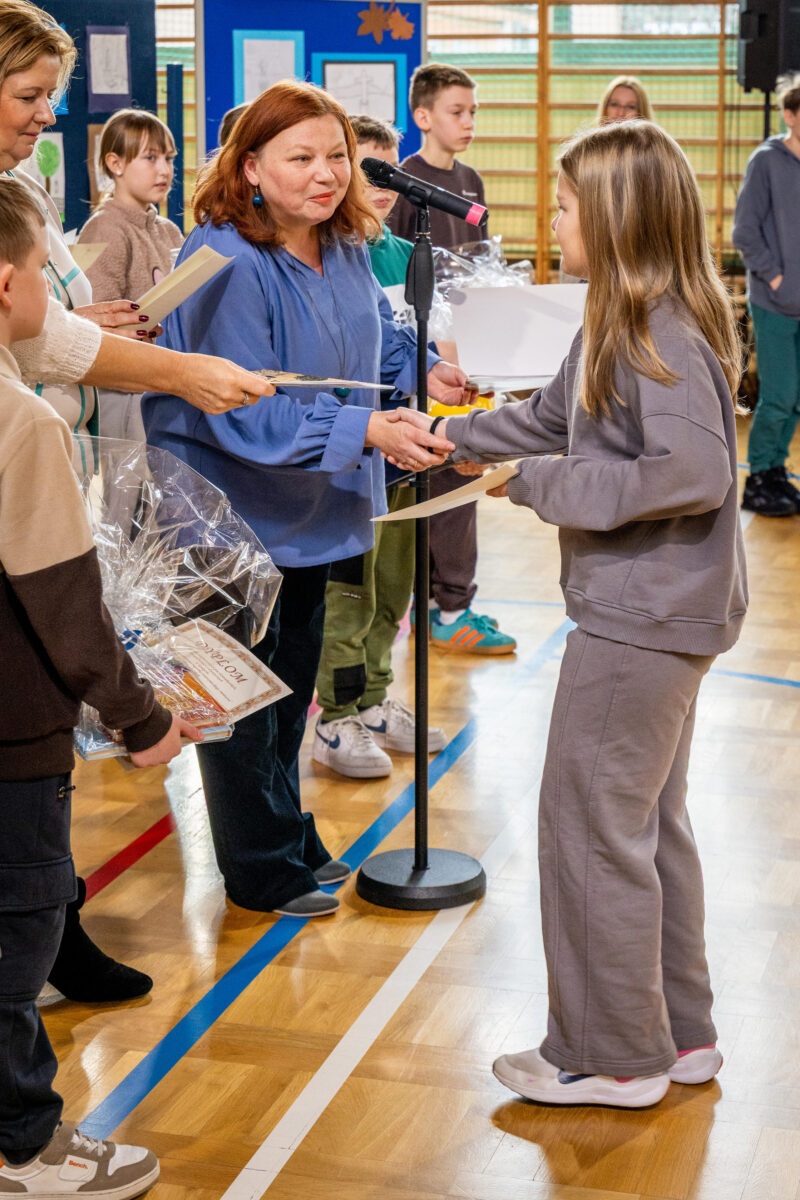 Szczególne słowa wdzięczności skierowano do Pani Dyrektor, nauczycieli oraz całego grona pedagogicznego za zaufanie, współpracę i gotowość do działania ramię w ramię z członkami Towarzystwa Miłośników Zwierzyńca. Prezeska TMZ podziękowała nauczycielkom, które bezpośrednio zaangażowane były w działania projektowe. Za koordynację konkursowych prac plastycznych oraz ich piękną ekspozycję – także w dniu uroczystości – szczególne wyrazy uznania otrzymała Pani Małgorzata Czochra-Welsyng, natomiast za opiekę nad Kołem Cmentarnych Detektywów — Pani Małgorzata Sankowska-Janeczek. To właśnie pod skrzydłami drugiej z wymienionych pań młodzi ludzie uczestniczyli w spacerach badawczych po zwierzynieckim cmentarzu, dokumentując nagrobki i poznając historię miejsca.