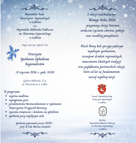2026-01-1210 stycznia 2026 r. w Galerii Biblioteki Wojewódzkiej im. Hieronima Łopacińskiego w Lublinie odbyło się Uroczyste Spotkanie Opłatkowe Regionalistów, zorganizowane przez Wojewódzką Radę Towarzystw Regionalnych w Lublinie oraz Wojewódzką Bibliotekę Publiczną im. Hieronima Łopacińskiego. Wydarzenie miało charakter noworocznego spotkania środowisk regionalnych, połączonego ze wspólną modlitwą, wystąpieniami zaproszonych gości oraz dzieleniem się opłatkiem.
